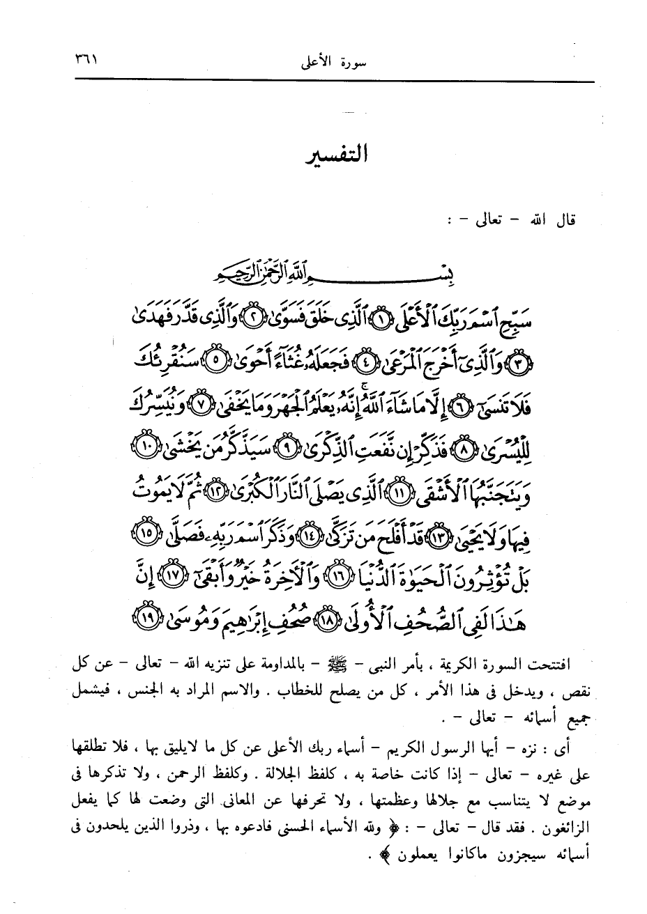 سَبِّحِ اسْمَ رَبِّكَ الْأَعْلَى (1) الَّذِي خَلَقَ فَسَوَّى (2) وَالَّذِي قَدَّرَ فَهَدى (3) وَالَّذِي أَخْرَجَ الْمَرْعى (4)