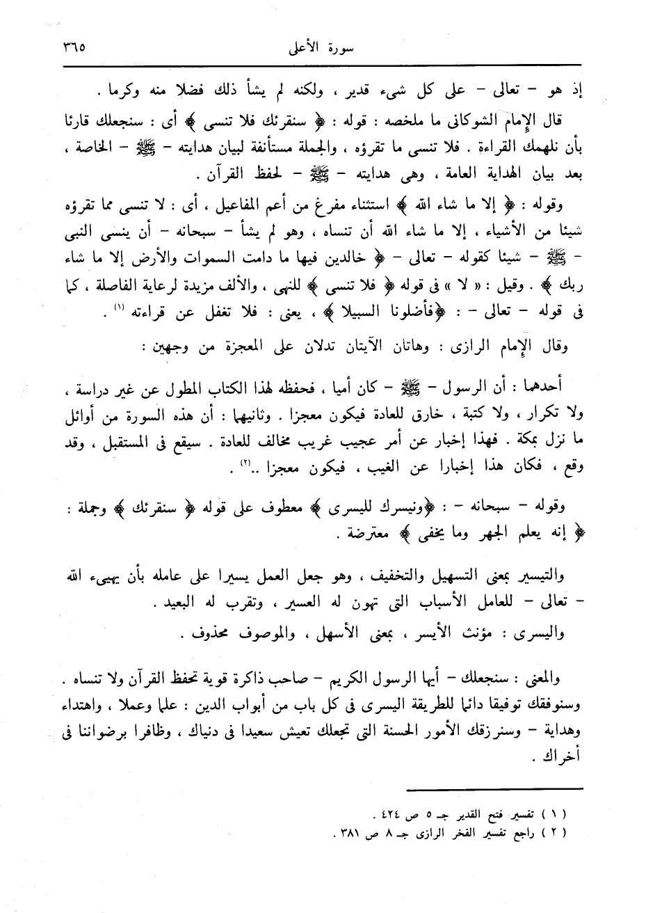 قال الإمام الشوكانى ما ملخصه: قوله: سَنُقْرِئُكَ فَلا تَنْسى أى: سنجعلك قارئا بأن نلهمك القراءة. فلا تنسى ما تقرؤه، والجملة مستأنفة لبيان هدايته صلى الله عليه وسلم الخاصة، بعد بيان الهداية العامة، وهي هدايته صلى الله عليه وسلم لحفظ القرآن.