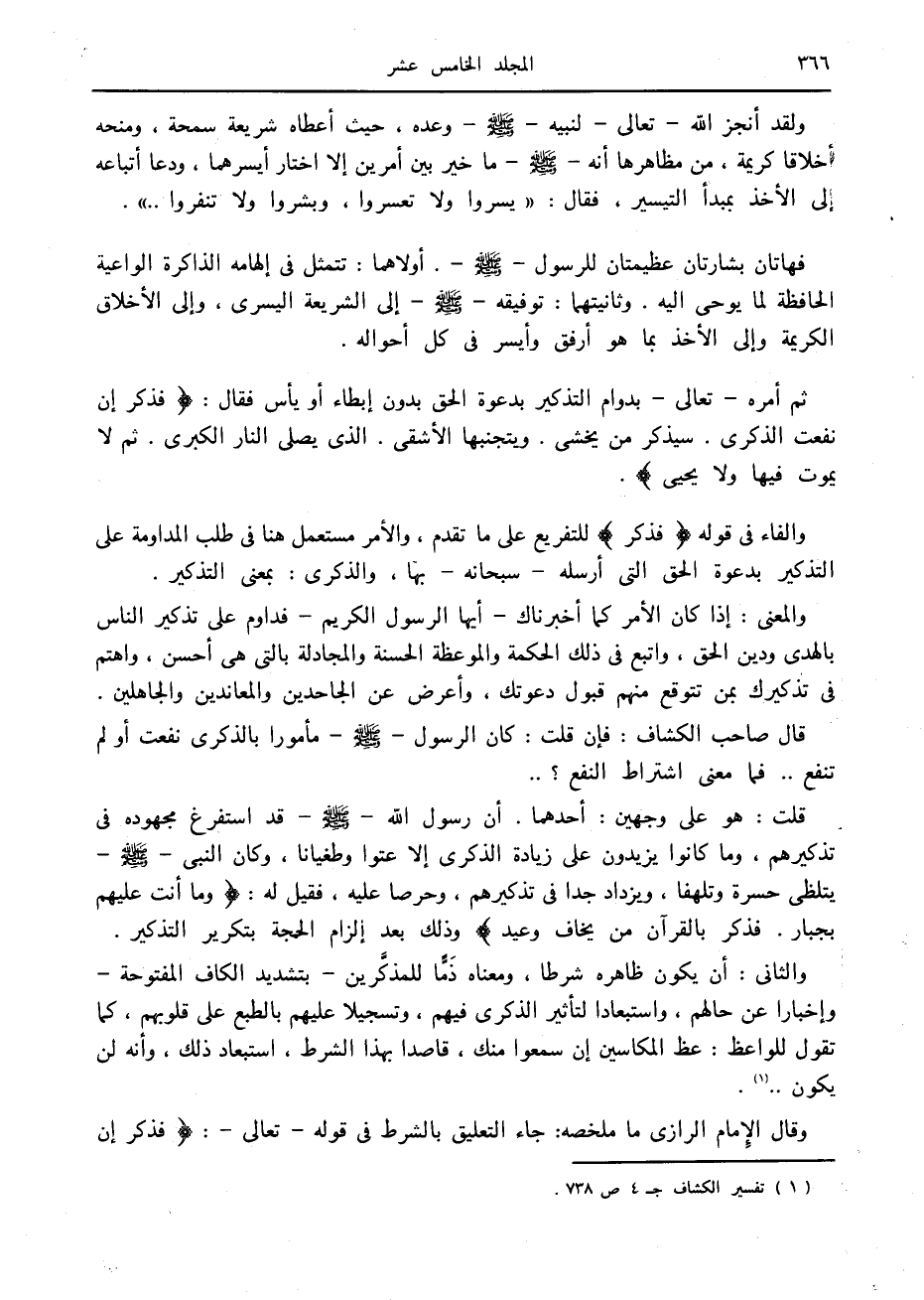 وقال الإمام الرازي ما ملخصه: جاء التعليق بالشرط في قوله- تعالى-: فَذَكِّرْ إِنْ