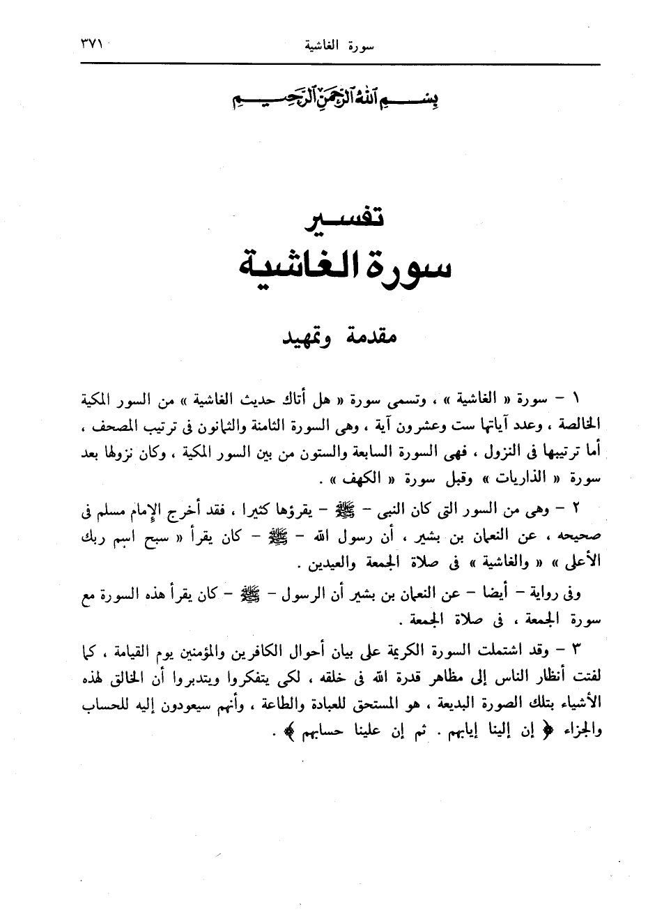 1- سورة «الغاشية» ، وتسمى سورة «هل أتاك حديث الغاشية» من السور المكية الخالصة، وعدد آياتها ست وعشرون آية، وهي السورة الثامنة والثمانون في ترتيب المصحف، أما ترتيبها في النزول، فهي السورة السابعة والستون من بين السور المكية، وكان نزولها بعد سورة «الذاريات» وقبل سورة «الكهف» .