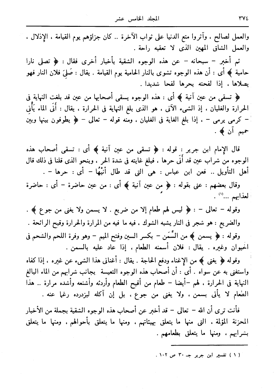 قال الإمام ابن جرير: قوله: تُسْقى مِنْ عَيْنٍ آنِيَةٍ أى: تسقى أصحاب هذه الوجوه من شراب عين قد أنى حرها، فبلغ غايته في شدة الحر، وبنحو الذي قلنا في ذلك قال أهل التأويل.. فعن ابن عباس: هي التي قد طال أنيها- أى: حرها-.