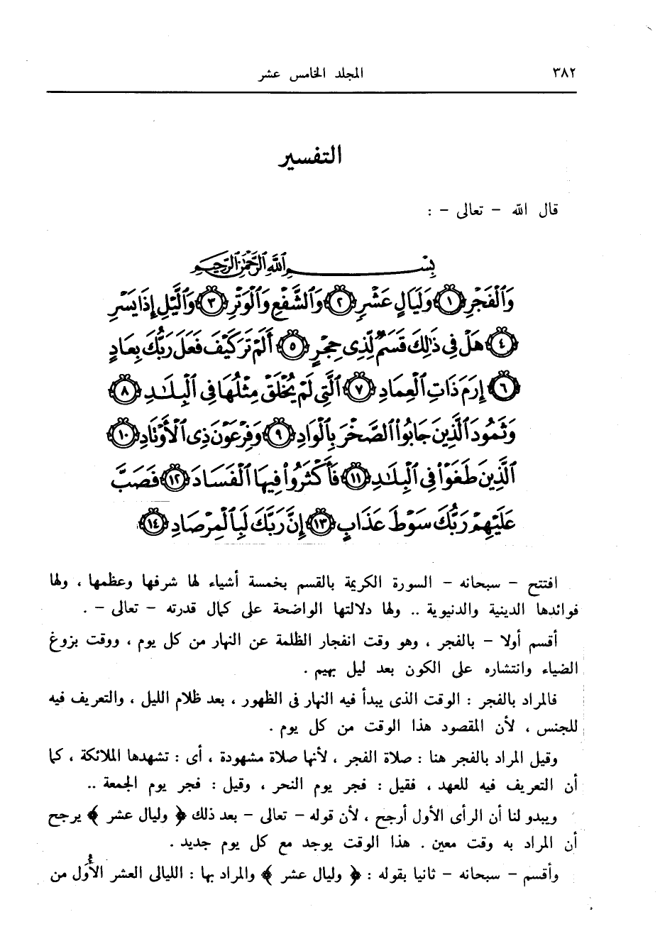 أقسم أولا- بالفجر، وهو وقت انفجار الظلمة عن النهار من كل يوم، ووقت بزوغ الضياء وانتشاره على الكون بعد ليل بهيم.