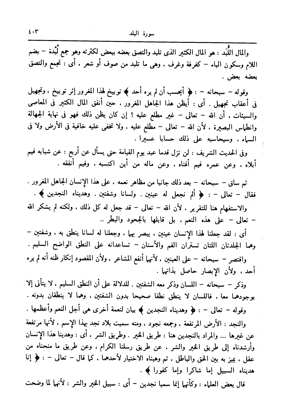 والنجد: الأرض المرتفعة، وجمعه نجود، ومنه سميت بلاد نجد بهذا الإسم، لأنها مرتفعة عن غيرها ... والمراد بالنجدين هنا: طريق الخير. وطريق الشر، أى: وهدينا هذا الإنسان وأرشدناه إلى طريق الخير والشر، عن طريق رسلنا الكرام، وعن طريق ما منحناه من عقل، يميز به بين الحق والباطل، ثم وهبناه الاختيار لأحدهما، كما قال- تعالى-: إِنَّا هَدَيْناهُ السَّبِيلَ إِمَّا شاكِراً وَإِمَّا كَفُوراً.