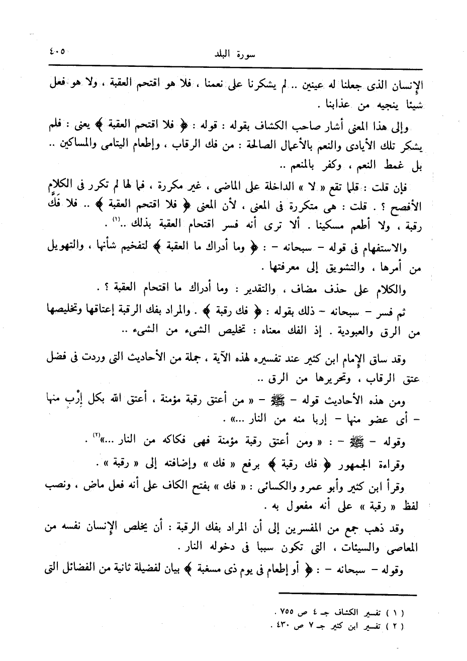 فإن قلت: قلما تقع «لا» الداخلة على الماضي، غير مكررة، فما لها لم تكرر في الكلام الأفصح؟. قلت: هي متكررة في المعنى، لأن المعنى فَلَا اقْتَحَمَ الْعَقَبَةَ.. فلا فكّ رقبة، ولا أطعم مسكينا. ألا ترى أنه فسر اقتحام العقبة بذلك.. «1» .