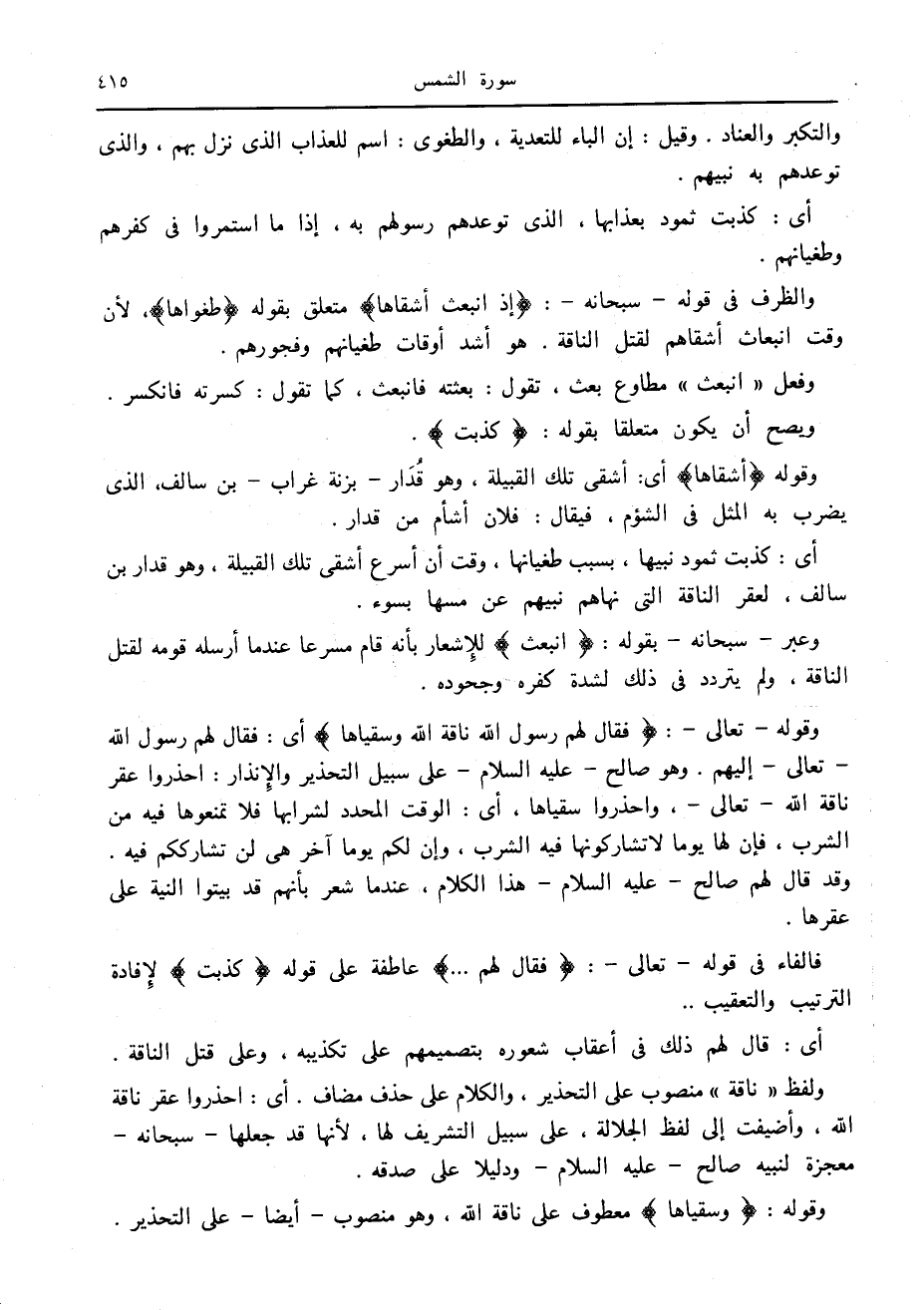 وقوله- تعالى-: فَقالَ لَهُمْ رَسُولُ اللَّهِ ناقَةَ اللَّهِ وَسُقْياها أى: فقال لهم رسول الله- تعالى- إليهم. وهو صالح- عليه السلام- على سبيل التحذير والإنذار: احذروا عقر ناقة الله- تعالى-، واحذروا سقياها، أى: الوقت المحدد لشرابها فلا تمنعوها فيه من الشرب، فإن لها يوما لا تشاركونها فيه الشرب، وإن لكم يوما آخر هي لن تشارككم فيه.