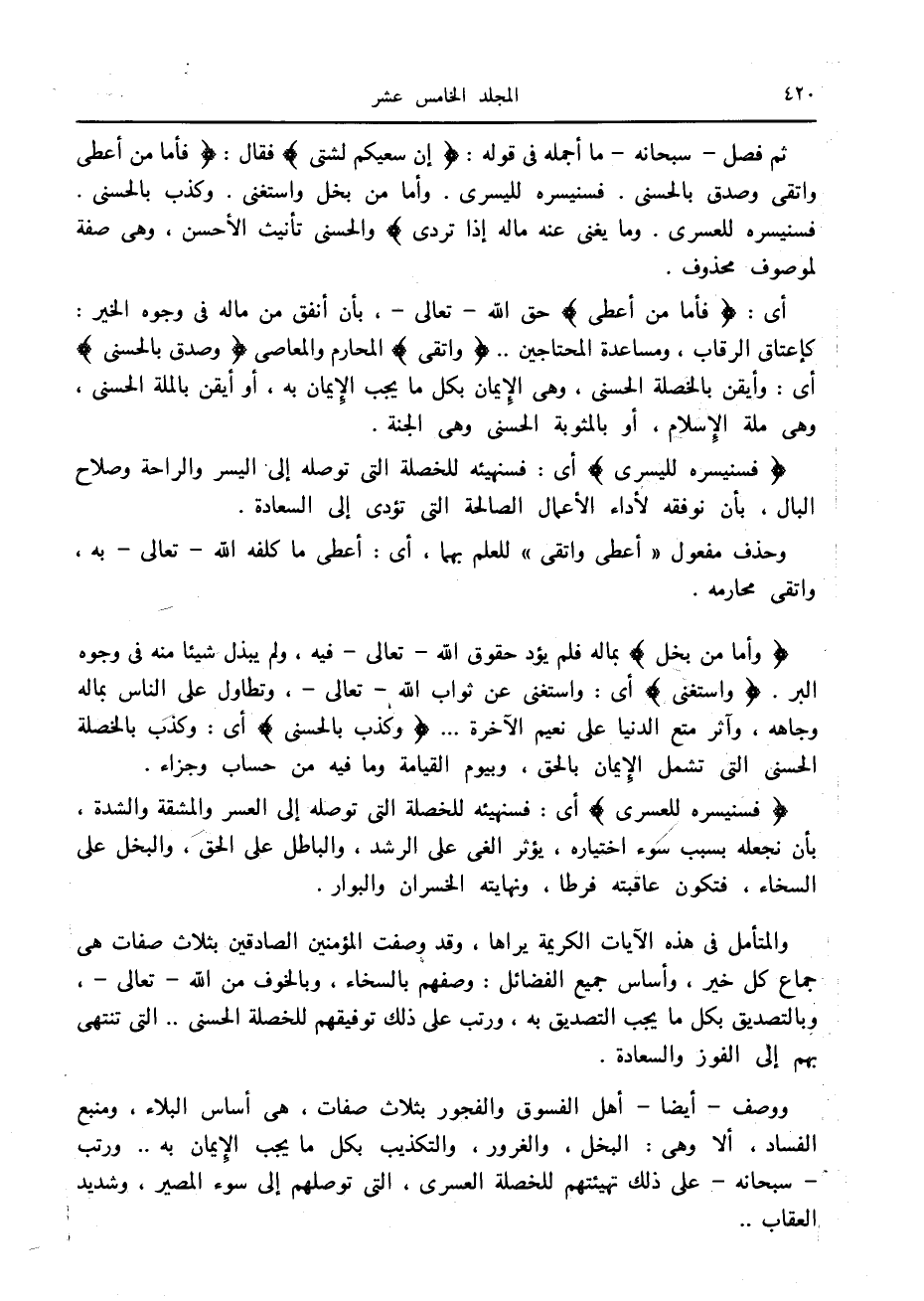 والمتأمل في هذه الآيات الكريمة يراها، وقد وصفت المؤمنين الصادقين بثلاث صفات هي جماع كل خير، وأساس جميع الفضائل: وصفهم بالسخاء، وبالخوف من الله- تعالى-، وبالتصديق بكل ما يجب التصديق به، ورتب على ذلك توفيقهم للخصلة الحسنى.. التي تنتهي بهم إلى الفوز والسعادة.