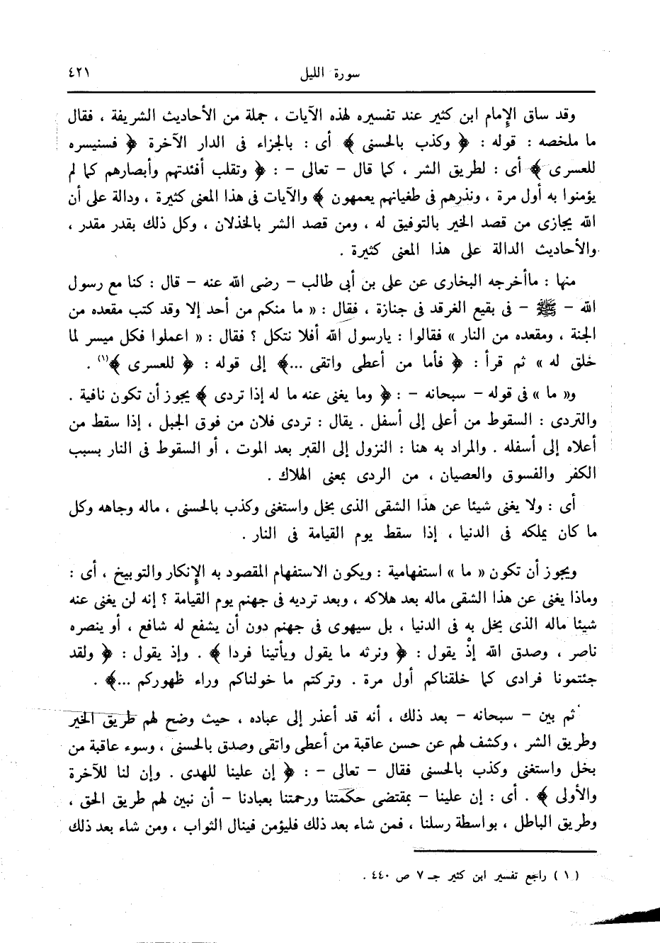 وقد ساق الإمام ابن كثير عند تفسيره لهذه الآيات، جملة من الأحاديث الشريفة، فقال ما ملخصه: قوله: وَكَذَّبَ بِالْحُسْنى أى: بالجزاء في الدار الآخرة فَسَنُيَسِّرُهُ لِلْعُسْرى أى: لطريق الشر، كما قال- تعالى-: وَنُقَلِّبُ أَفْئِدَتَهُمْ وَأَبْصارَهُمْ كَما لَمْ يُؤْمِنُوا بِهِ أَوَّلَ مَرَّةٍ، وَنَذَرُهُمْ فِي طُغْيانِهِمْ يَعْمَهُونَ والآيات في هذا المعنى كثيرة، ودالة على أن الله يجازى من قصد الخير بالتوفيق له، ومن قصد الشر بالخذلان، وكل ذلك بقدر مقدر، والأحاديث الدالة على هذا المعنى كثيرة.