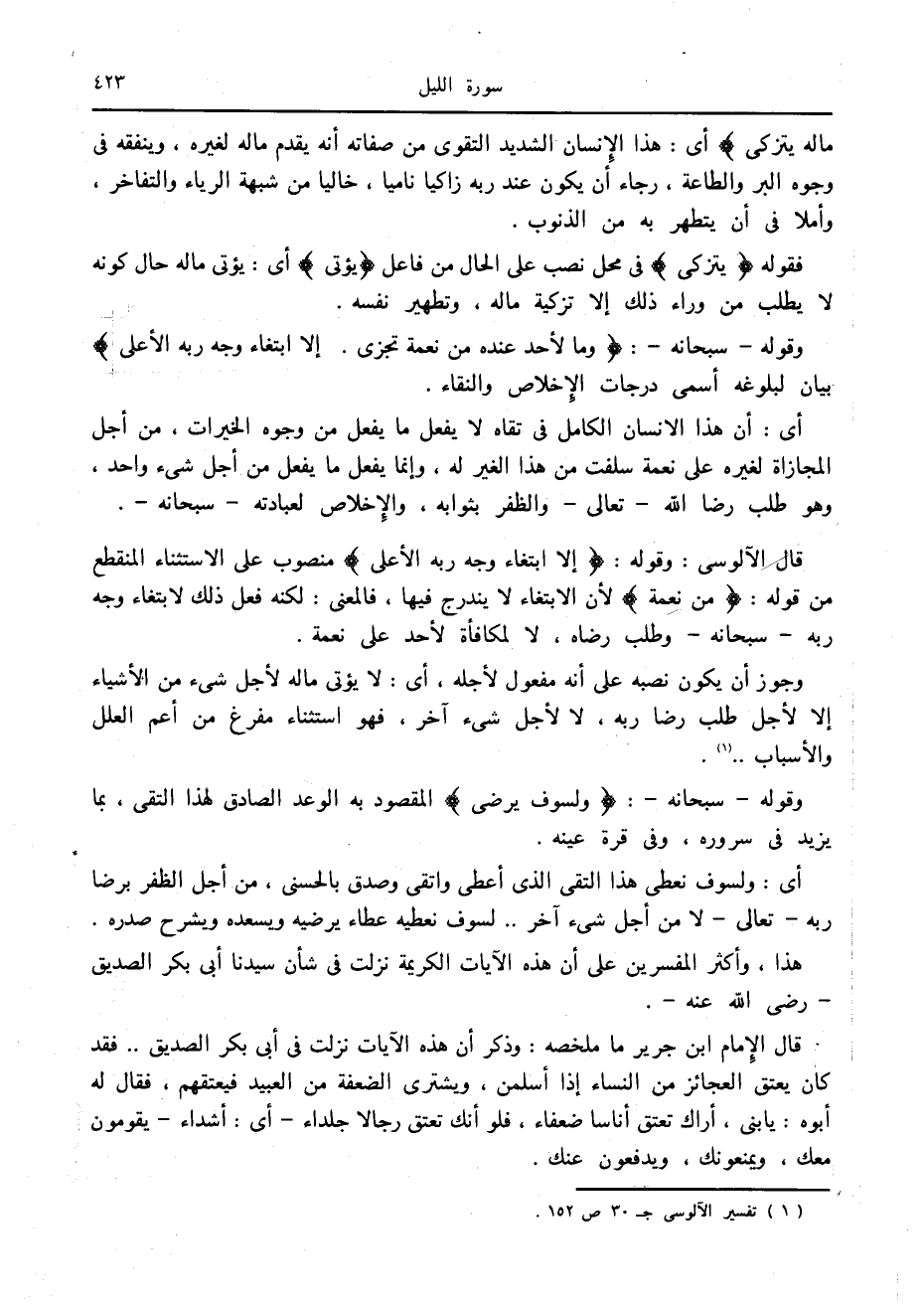 قال الإمام ابن جرير ما ملخصه: وذكر أن هذه الآيات نزلت في أبى بكر الصديق.. فقد كان يعتق العجائز من النساء إذا أسلمن، ويشترى الضعفة من العبيد فيعتقهم، فقال له أبوه: يا بنى، أراك تعتق أناسا ضعفاء، فلو أنك تعتق رجالا جلداء- أى: أشداء- يقومون معك، ويمنعونك، ويدفعون عنك.