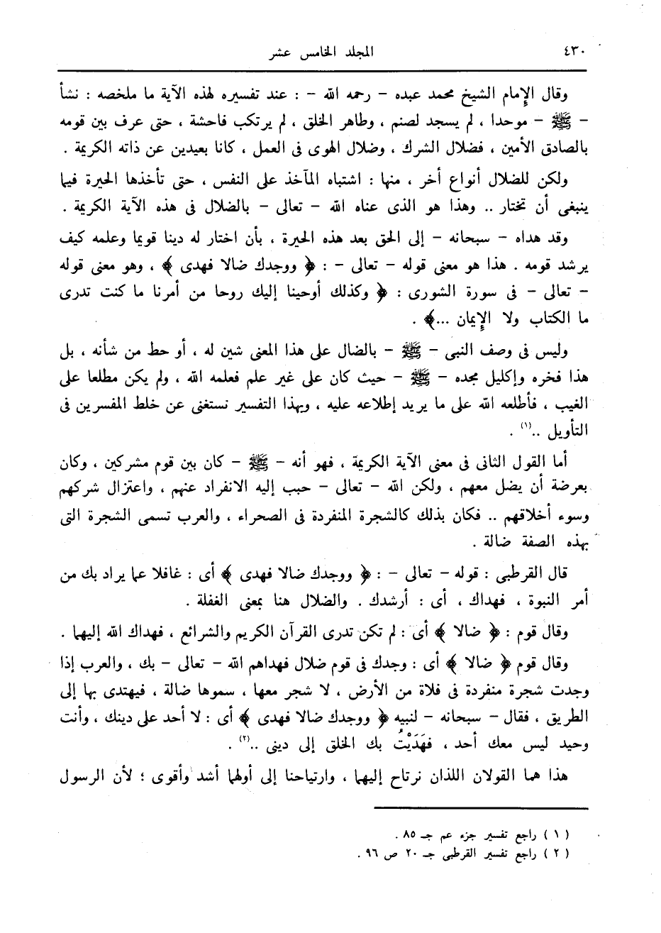 وقال الإمام الشيخ محمد عبده- رحمه الله-: عند تفسيره لهذه الآية ما ملخصه: نشأ صلى الله عليه وسلم موحدا، لم يسجد لصنم، وطاهر الخلق، لم يرتكب فاحشة، حتى عرف بين قومه بالصادق الأمين، فضلال الشرك، وضلال الهوى في العمل، كانا بعيدين عن ذاته الكريمة.