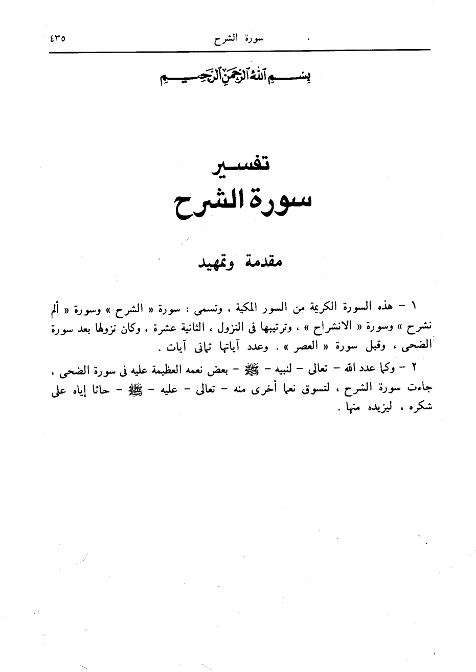 1- هذه السورة الكريمة من السور المكية، وتسمى: سورة «الشرح» وسورة «ألم نشرح» وسورة «الانشراح» ، وترتيبها في النزول، الثانية عشرة، وكان نزولها بعد سورة الضحى، وقبل سورة «العصر» . وعدد آياتها ثماني آيات.