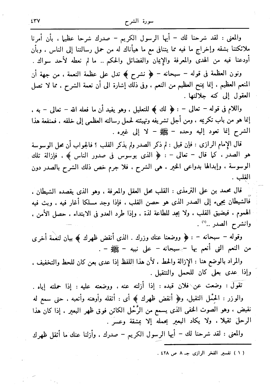 قال الإمام الرازي: فإن قيل: لم ذكر الصدر ولم يذكر القلب؟ فالجواب أن محل الوسوسة هو الصدر، كما قال- تعالى-: الَّذِي يُوَسْوِسُ فِي صُدُورِ النَّاسِ، فإزالة تلك الوسوسة، وإبدالها بدواعى الخير، هي الشرح، فلا جرم خص ذلك الشرح بالصدر دون القلب.