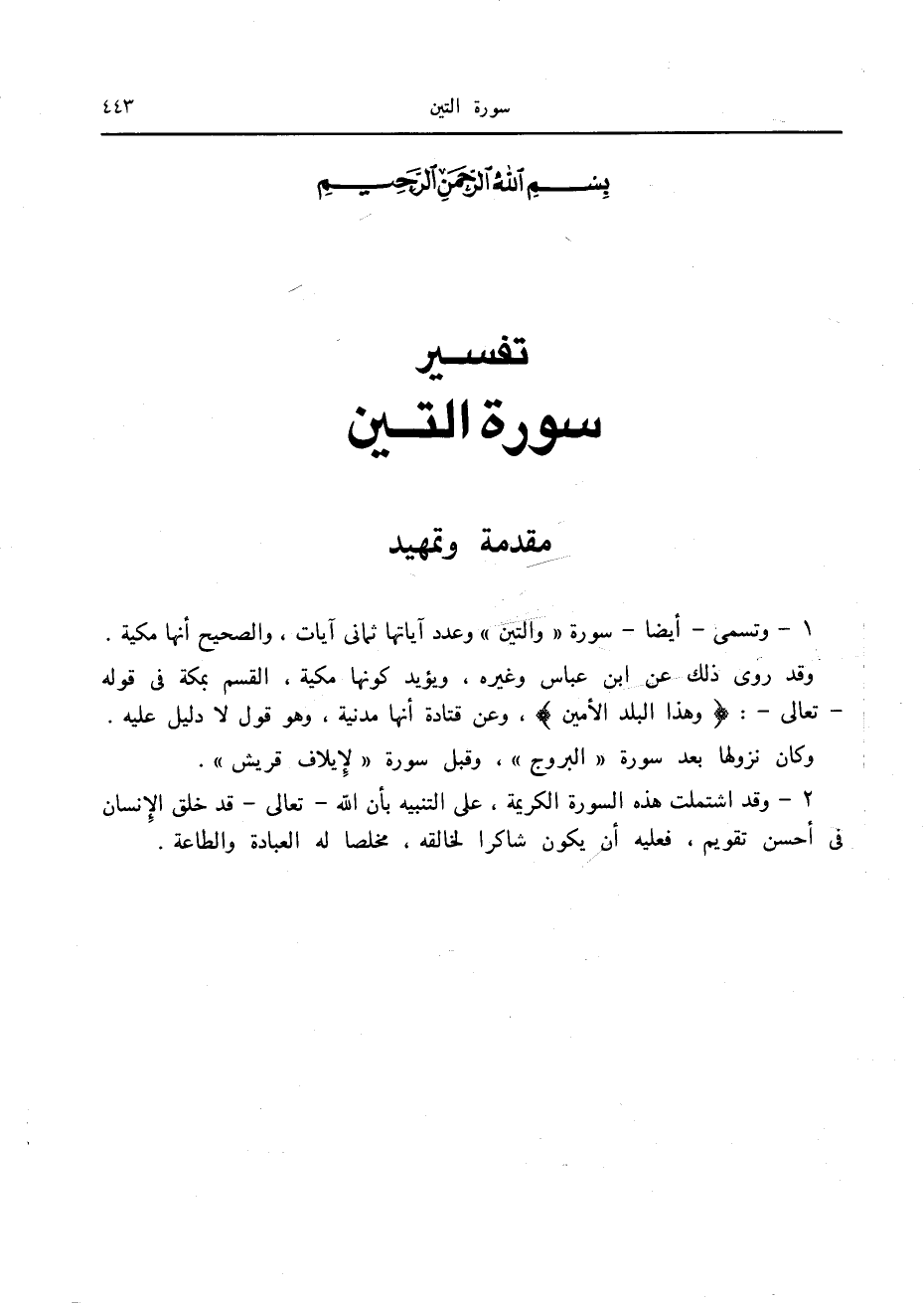 1- وتسمى- أيضا- سورة «والتين» وعدد آياتها ثماني آيات، والصحيح أنها مكية.