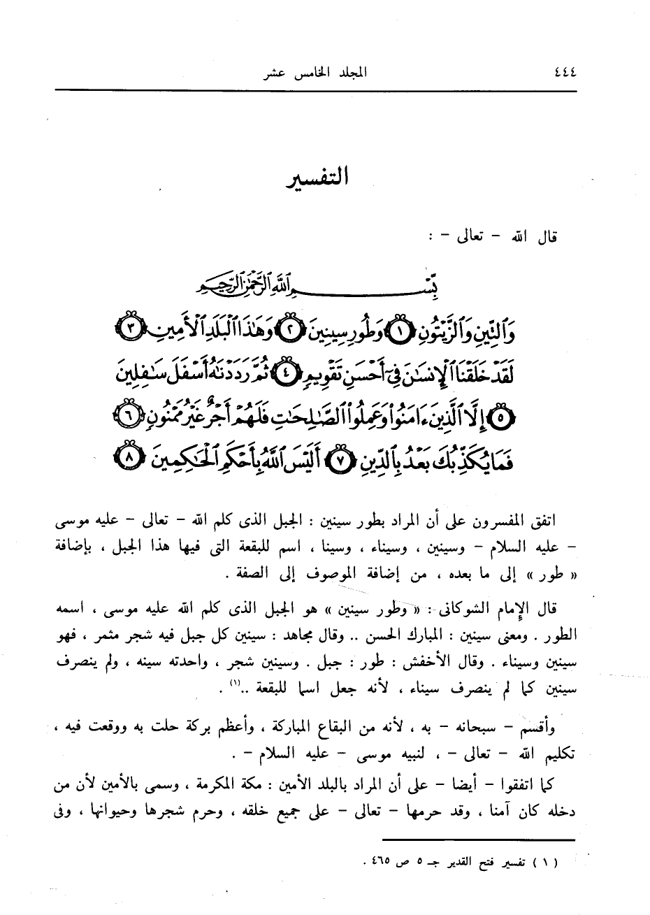 قال الإمام الشوكانى: «وطور سينين» هو الجبل الذي كلم الله عليه موسى، اسمه الطور. ومعنى سينين: المبارك الحسن.. وقال مجاهد: سينين كل جبل فيه شجر مثمر، فهو سينين وسيناء. وقال الأخفش: طور: جبل. وسينين شجر، واحدته سينه، ولم ينصرف سينين كما لم ينصرف سيناء، لأنه جعل اسما للبقعة.. «1» .