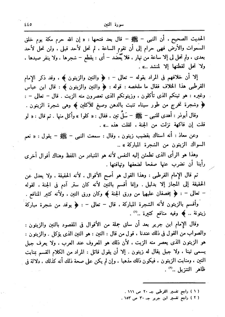 إلا أن خلافهم في المراد بقوله- تعالى-: وَالتِّينِ وَالزَّيْتُونِ، وقد ذكر الإمام القرطبي هذا الخلاف فقال ما ملخصه: قوله: وَالتِّينِ وَالزَّيْتُونِ: قال ابن عباس وغيره: هو تينكم الذي تأكلون، وزيتونكم الذي تعصرون منه الزيت. قال- تعالى-: