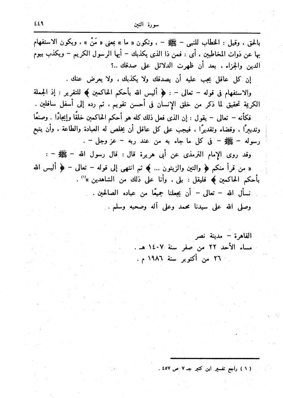 «من قرأ منكم وَالتِّينِ وَالزَّيْتُونِ ... ثم انتهى إلى قوله- تعالى- أَلَيْسَ اللَّهُ بِأَحْكَمِ الْحاكِمِينَ فليقل: بلى، وأنا على ذلك من الشاهدين» «1» .