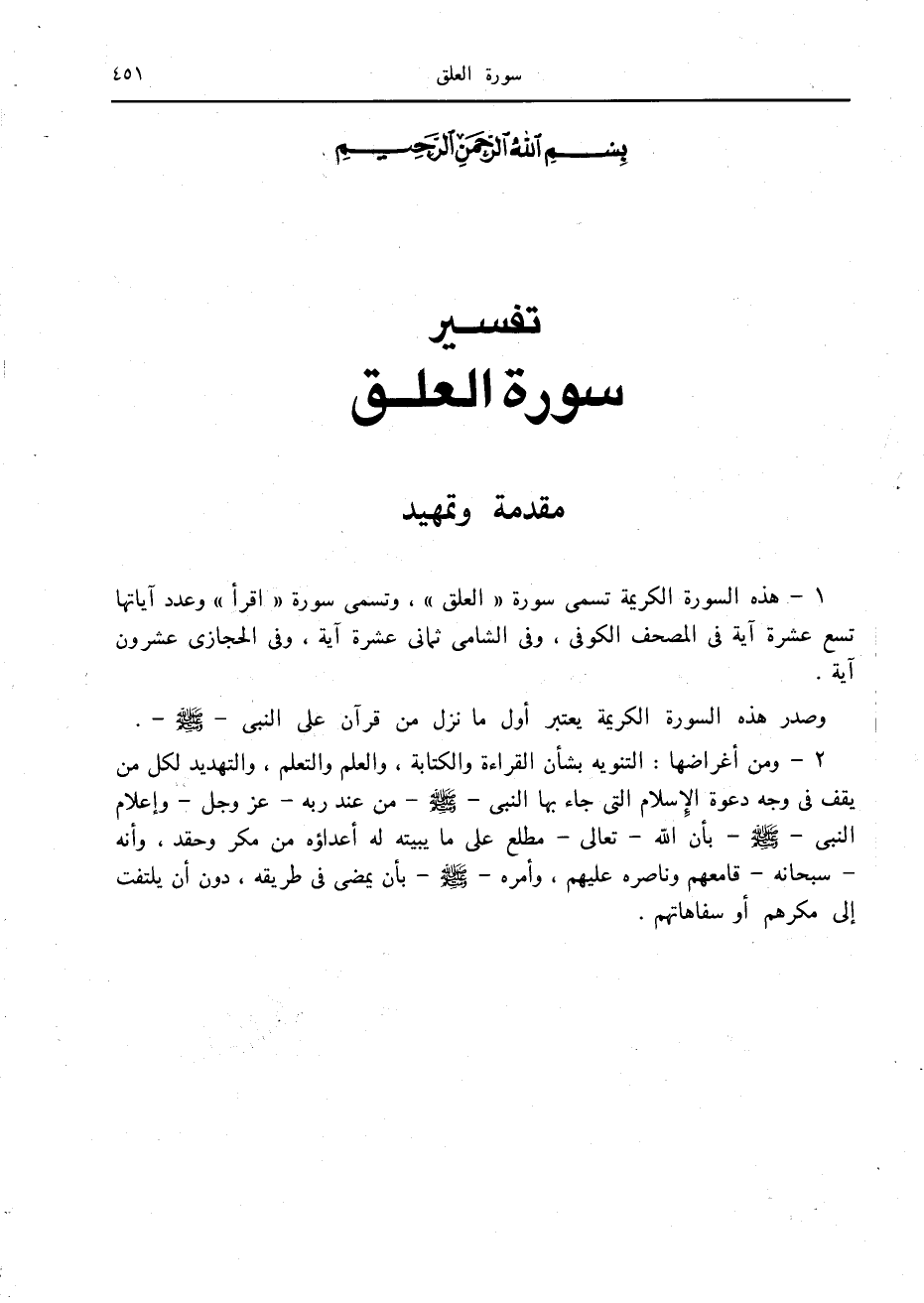 1- هذه السورة الكريمة تسمى سورة «العلق» ، وتسمى سورة «اقرأ» وعدد آياتها تسع عشرة آية في المصحف الكوفي، وفي الشامي ثماني عشرة آية، وفي الحجازي عشرون آية.
