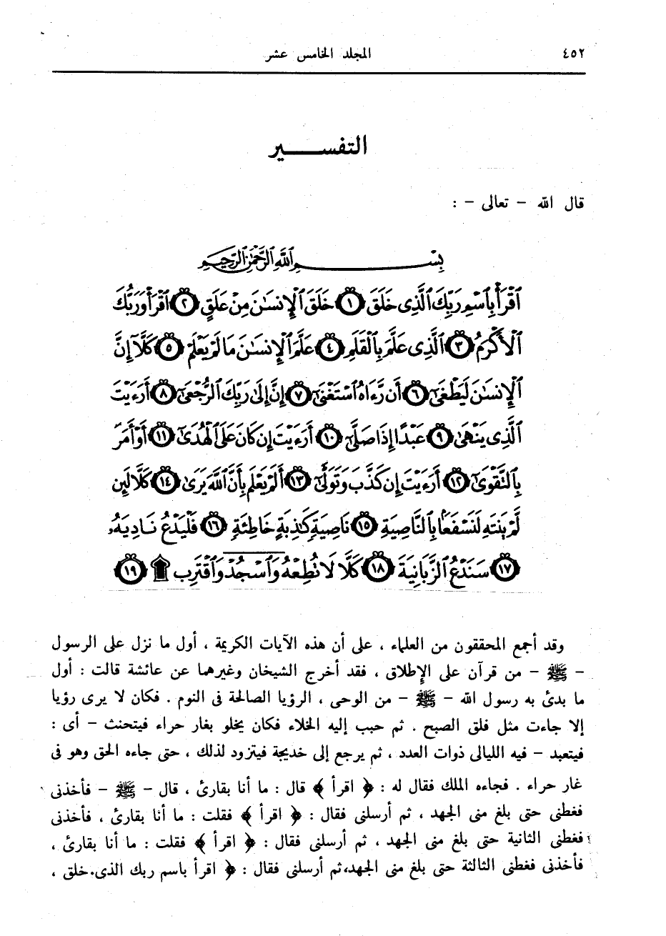 عَلَّمَ الْإِنْسانَ ما لَمْ يَعْلَمْ (5) كَلاَّ إِنَّ الْإِنْسانَ لَيَطْغى (6) أَنْ رَآهُ اسْتَغْنى (7) إِنَّ إِلى رَبِّكَ الرُّجْعى (8) أَرَأَيْتَ الَّذِي يَنْهى (9)