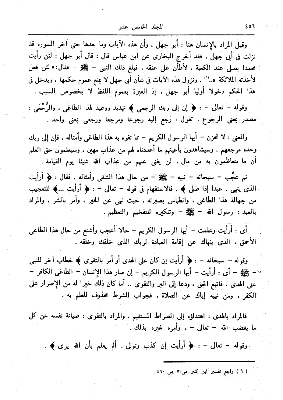وقيل المراد بالإنسان هنا: أبو جهل، وأن هذه الآيات وما بعدها حتى آخر السورة قد نزلت في أبى جهل، فقد أخرج البخاري عن ابن عباس قال: قال أبو جهل: لئن رأيت محمدا يصلى عند الكعبة، لأطأن على عنقه، فبلغ ذلك النبي صلى الله عليه وسلم فقال: «لئن فعل لأخذته الملائكة» .. «1» . ونزول هذه الآيات في شأن أبى جهل لا يمنع عموم حكمها، ويدخل في هذا الحكم دخولا أوليا أبو جهل، إذ العبرة بعموم اللفظ لا بخصوص السبب.