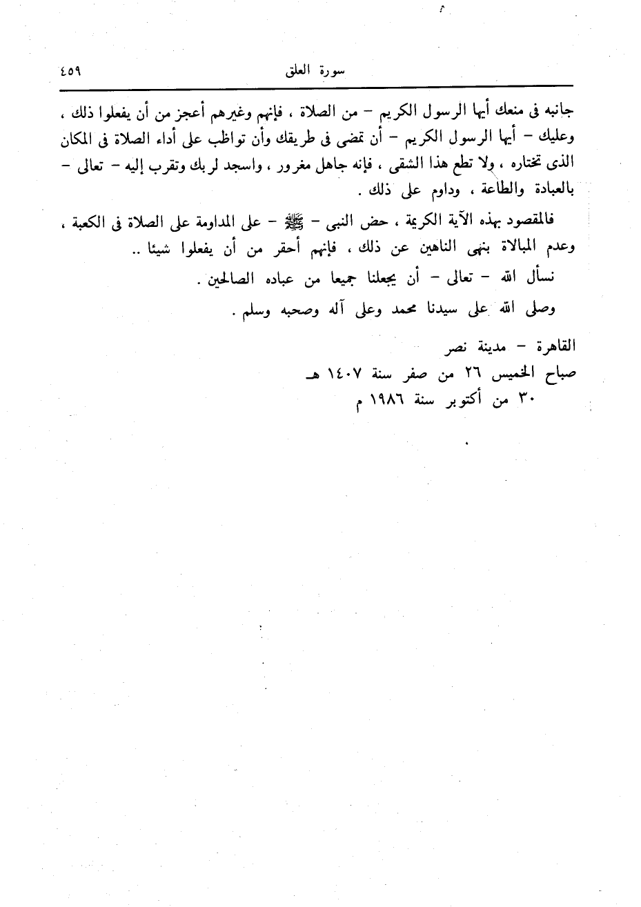 جانبه في منعك أيها الرسول الكريم- من الصلاة، فإنهم وغيرهم أعجز من أن يفعلوا ذلك، وعليك- أيها الرسول الكريم- أن تمضى في طريقك وأن تواظب على أداء الصلاة في المكان الذي تختاره، ولا تطع هذا الشقي، فإنه جاهل مغرور، واسجد لربك وتقرب إليه- تعالى- بالعبادة والطاعة، وداوم على ذلك.
