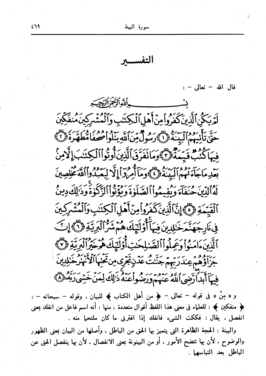 لَمْ يَكُنِ الَّذِينَ كَفَرُوا مِنْ أَهْلِ الْكِتابِ وَالْمُشْرِكِينَ مُنْفَكِّينَ حَتَّى تَأْتِيَهُمُ الْبَيِّنَةُ (1) رَسُولٌ مِنَ اللَّهِ يَتْلُوا صُحُفاً مُطَهَّرَةً (2) فِيها كُتُبٌ قَيِّمَةٌ (3) وَما تَفَرَّقَ الَّذِينَ أُوتُوا الْكِتابَ إِلاَّ مِنْ بَعْدِ ما جاءَتْهُمُ الْبَيِّنَةُ (4)