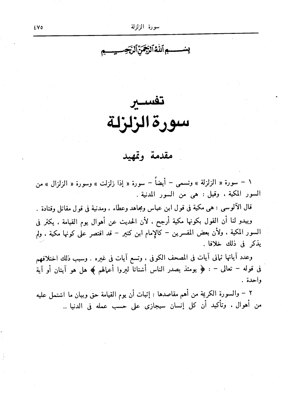 1- سورة «الزلزلة» وتسمى- أيضا- سورة «إذا زلزلت» وسورة «الزلزال» من السور المكية، وقيل: هي من السور المدنية.