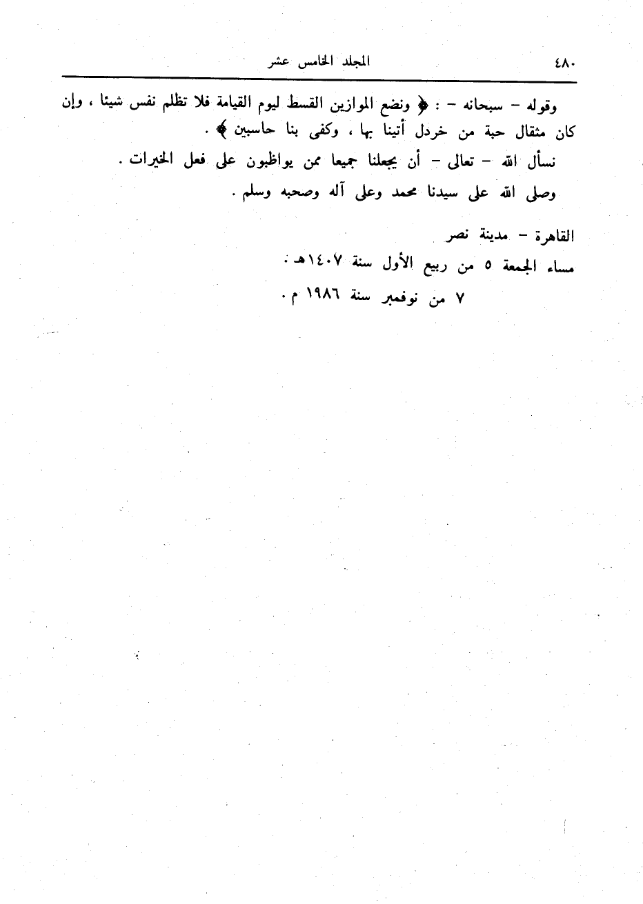 وقوله- سبحانه-: وَنَضَعُ الْمَوازِينَ الْقِسْطَ لِيَوْمِ الْقِيامَةِ فَلا تُظْلَمُ نَفْسٌ شَيْئاً، وَإِنْ كانَ مِثْقالَ حَبَّةٍ مِنْ خَرْدَلٍ أَتَيْنا بِها، وَكَفى بِنا حاسِبِينَ.