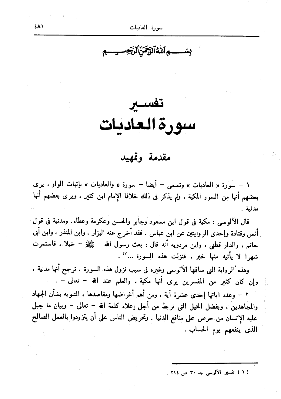 1- سورة «العاديات» وتسمى- أيضا- سورة «والعاديات» بإثبات الواو، يرى بعضهم أنها من السور المكية، ولم يذكر في ذلك خلافا الإمام ابن كثير، ويرى بعضهم أنها مدنية.