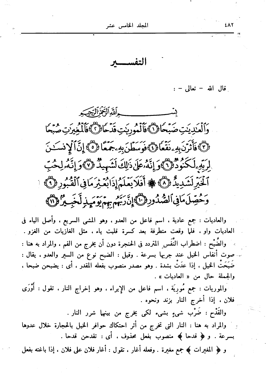 وَالْعادِياتِ ضَبْحاً (1) فَالْمُورِياتِ قَدْحاً (2) فَالْمُغِيراتِ صُبْحاً (3) فَأَثَرْنَ بِهِ نَقْعاً (4)