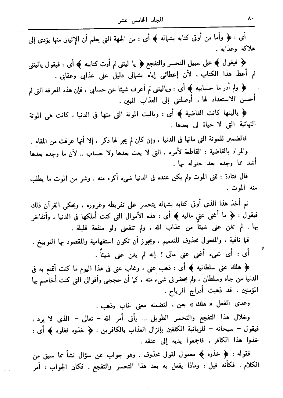 هَلَكَ عَنِّي سُلْطانِيَهْ أى: ذهب عنى، وغاب عنى في هذا اليوم ما كنت أتمتع به في الدنيا من جاه وسلطان، ولم يحضرني شيء منه، كما أن حججي وأقوالى التي كنت أخاصم بها المؤمنين. قد ذهبت أدراج الرياح.
