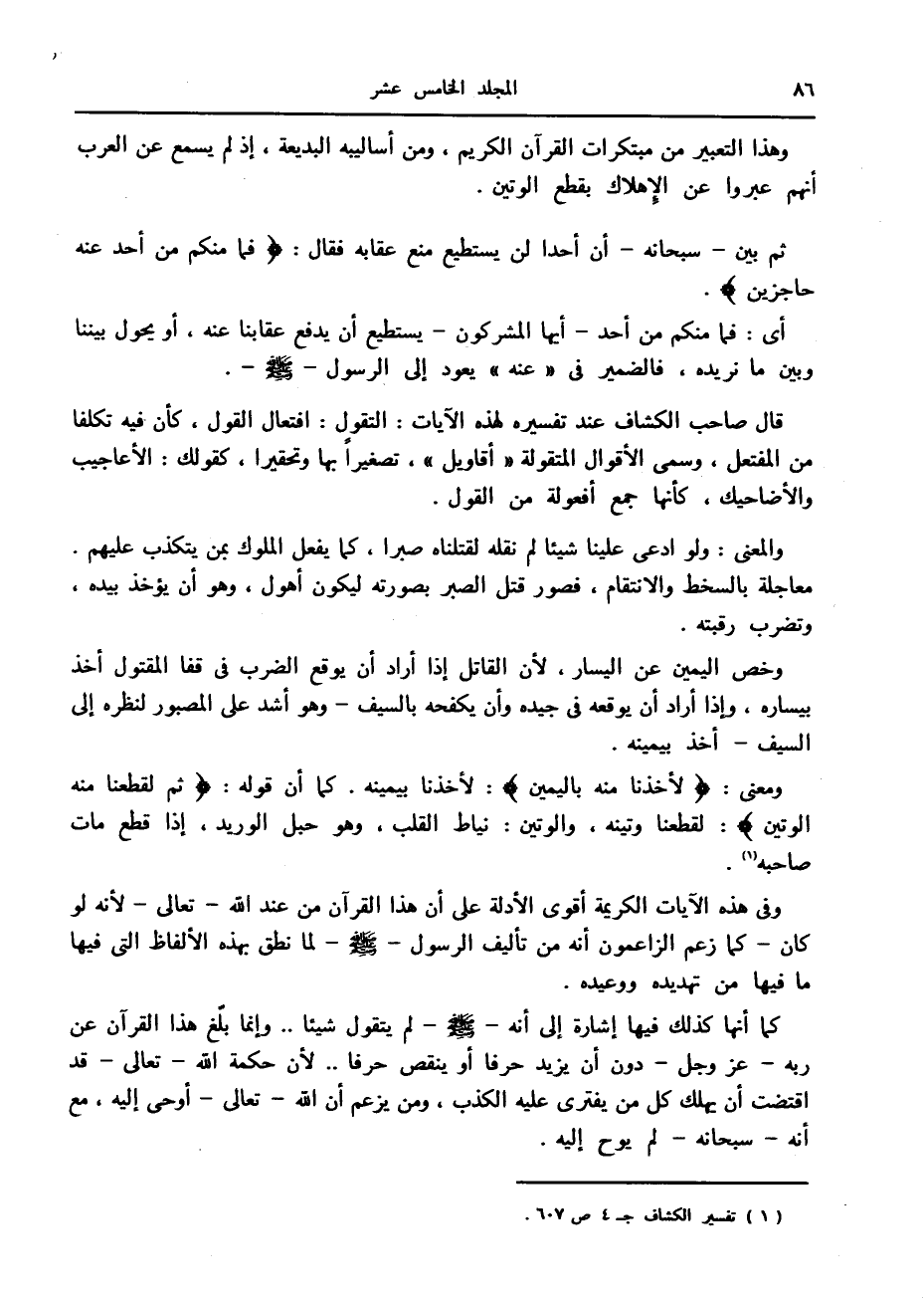 قال صاحب الكشاف عند تفسيره لهذه الآيات: التقول: افتعال القول، كأن فيه تكلفا من المفتعل، وسمى الأقوال المتقولة «أقاويل» ، تصغيرا بها وتحقيرا، كقولك: الأعاجيب والأضاحيك، كأنها جمع أفعولة من القول.