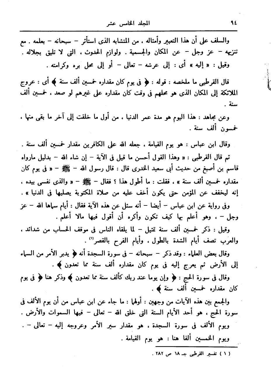ثم قال القرطبي: «وهذا القول أحسن ما قيل في الآية- إن شاء الله- بدليل ما رواه قاسم بن أصبغ من حديث أبى سعيد الخدري قال: قال رسول الله صلى الله عليه وسلم «في يوم كان مقداره خمسين ألف سنة» ، فقلت: ما أطول هذا؟ فقال صلى الله عليه وسلم «والذي نفسي بيده، إنه ليخفف عن المؤمن حتى يكون أخف عليه من صلاة المكتوبة يصليها في الدنيا» .