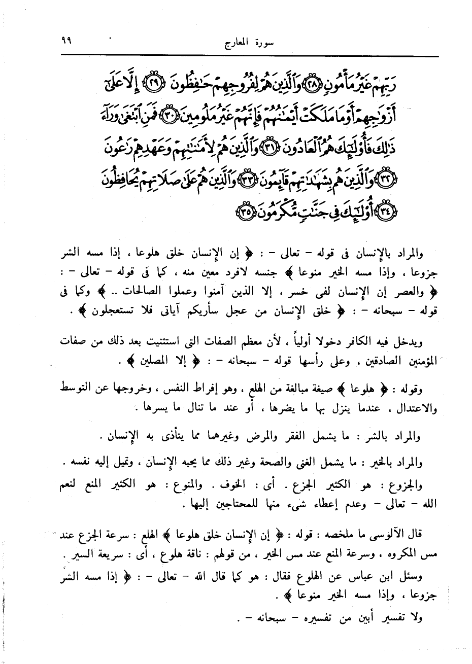 قال الآلوسى ما ملخصه: قوله: إِنَّ الْإِنْسانَ خُلِقَ هَلُوعاً الهلع: سرعة الجزع عند مس المكروه، وسرعة المنع عند مس الخير، من قولهم: ناقة هلوع، أى: سريعة السير.