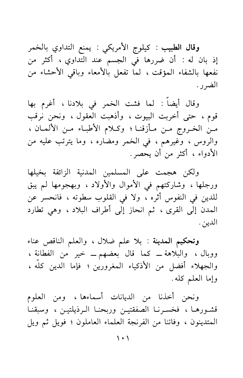 وقال أيضا: لما فشت الخمر في بلادنا، أغرم بها قوم، حتى أخربت البيوت، وأذهبت العقول، ونحن نرقب من الخروج من مأزقنا. وكلام الأطباء من الألمان، والروس، وغيرهم، في الخمر ومضاره، وما يترتب عليه من الأدواء، أكثر من أن يحصر.