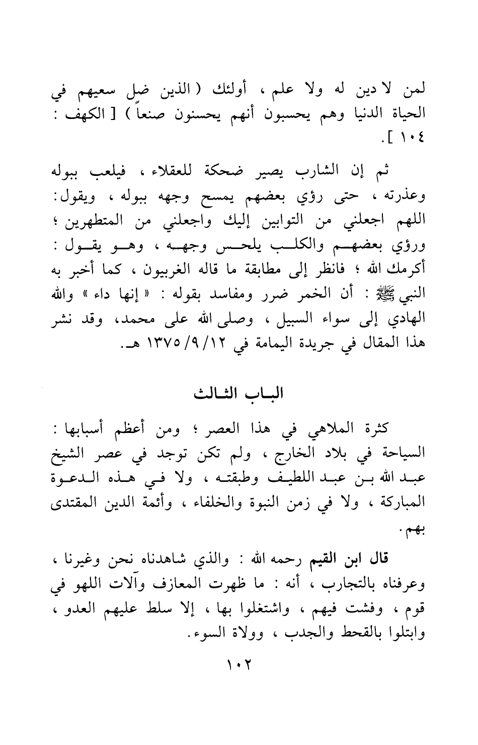 ثم إن الشارب يصير ضحكة للعقلاء، فيلعب ببوله وعذرته، حتى رؤي بعضهم يمسح وجهه ببوله، ويقول: اللهم اجعلني من التوابين إليك, واجعلني من المتطهرين. ورؤي بعضهم والكلب يلحس وجهه، وهو يقول: أكرمك الله. فانظر إلى مطابقة ما قاله الغربيون، كما أخبر به النبي صلى الله عليه وسلم أن الخمر ضرر ومفاسد بقوله: (إنها داء) , والله الهادي إلى سواء السبيل، وصلى الله على محمد، وقد نشر هذا المقال في جريدة اليمامة في 12/9/1375 هـ.