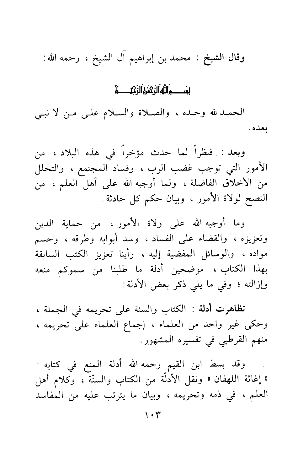 فنظرا لما حدث مؤخرا في هذه البلاد، من الأمور التي توجب غضب الرب، وفساد المجتمع، والتحلل من الأخلاق الفاضلة، ولما أوجبه الله على أهل العلم من النصح لولاة الأمور، وبيان حكم كل حادثة وما أوجبه الله على ولاة الأمور من حماية الدين وتعزيزه، والقضاء على الفساد، وسد أبوابه وطرقة، وحسم مواده، والوسائل المفضية إليه، رأينا تعزيز الكتب السابقة بهذا الكتاب، موضحين أدلة ما طلبنا من سموكم منعه وإزالته. وفي ما يلي ذكر بعض الأدلة. تظاهرت أدلة الكتاب والسنة على تحريمه في الجملة، وحكى غير واحد من العلماء، إجماع العلماء على تحريمه، منهم القرطبي في تفسيره المشهور.