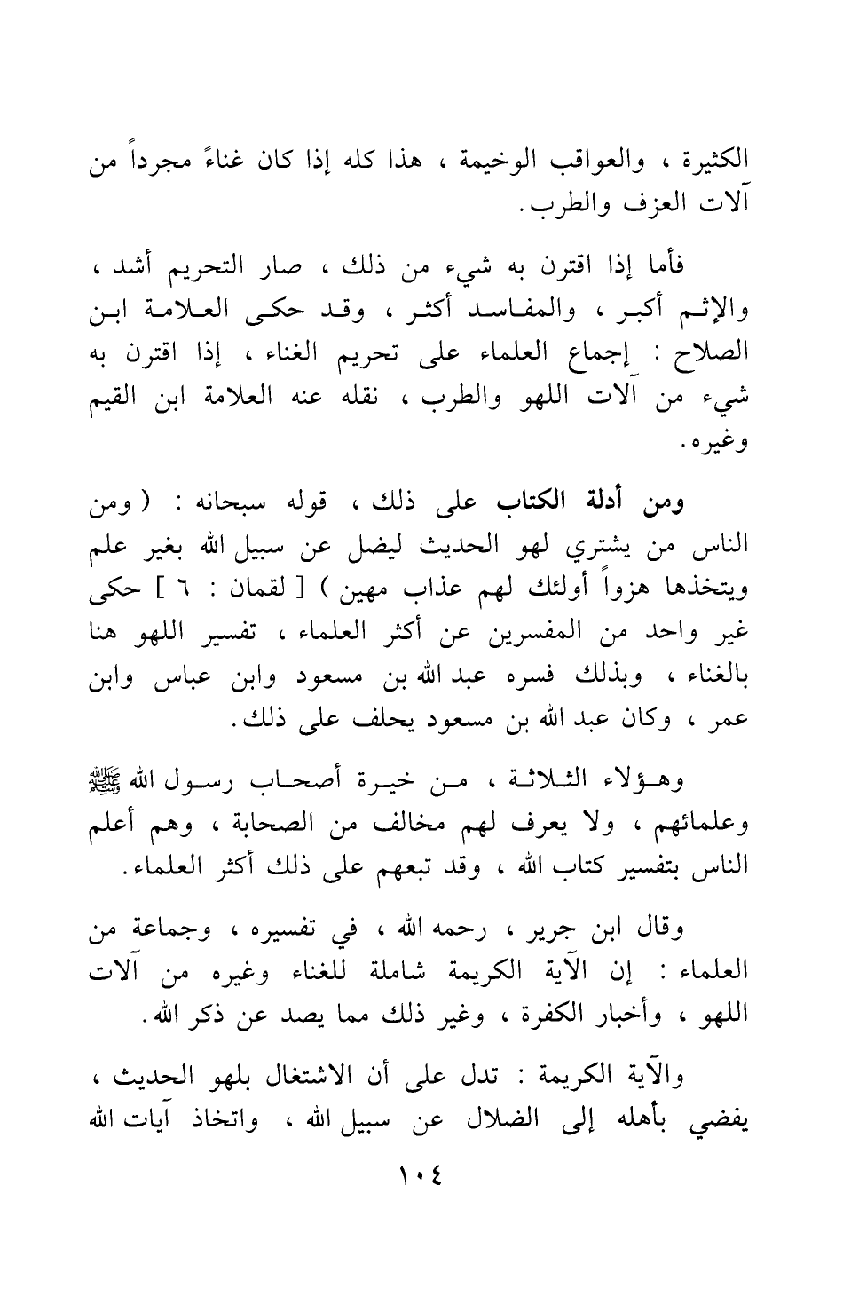 ومن أدلة الكتاب على ذلك، قوله سبحانه: {وَمِنَ النَّاسِ مَنْ يَشْتَرِي لَهْوَ الْحَدِيثِ لِيُضِلَّ عَنْ سَبِيلِ اللَّهِ بِغَيْرِ عِلْمٍ وَيَتَّخِذَهَا هُزُواً أُولَئِكَ لَهُمْ عَذَابٌ مُهِينٌ} [سورة لقمان آية: 6] حكى غير واحد من المفسرين عن أكثر العلماء، تفسير اللهو هنا بالغناء، وبذلك فسره عبد الله بن مسعود وابن عباس وابن عمر، وكان عبد الله بن مسعود يحلف على ذلك.