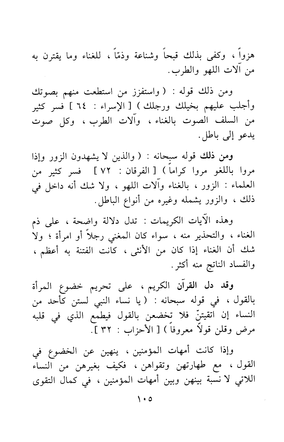 ومن ذلك قوله: {وَاسْتَفْزِزْ مَنِ اسْتَطَعْتَ مِنْهُمْ بِصَوْتِكَ وَأَجْلِبْ عَلَيْهِمْ بِخَيْلِكَ وَرَجِلِكَ} [سورة الإسراء آية: 64] فسر كثير من السلف الصوت بالغناء، وآلات الطرب، وكل صوت يدعو إلى باطل. ومن ذلك قوله سبحانه: {وَالَّذِينَ لا يَشْهَدُونَ الزُّورَ وَإِذَا مَرُّوا بِاللَّغْوِ مَرُّوا كِرَاماً} [سورة الفرقان آية: 72] فسر كثير من العلماء: الزور، بالغناء وآلات اللهو، ولا شك أنه داخل في ذلك، والزور يشمله وغيره من أنواع الباطل.