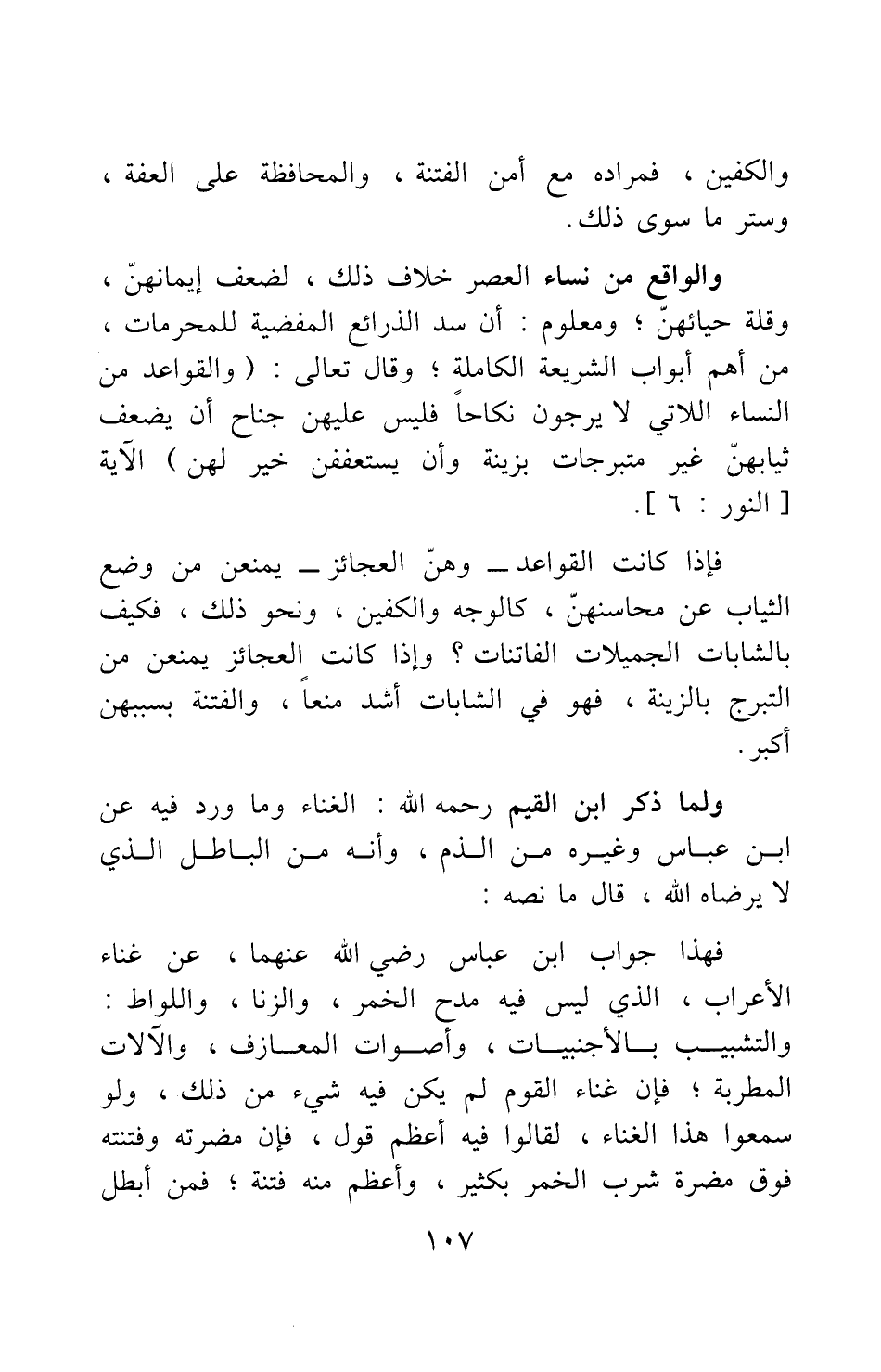والواقع من نساء العصر خلاف ذلك، لضعف إيمانهن، وقلة حيائهن؟ ومعلوم أن سد الذرائع المفضية للمحرمات، من أهم أبواب الشريعة الكاملة. وقال تعالى: {وَالْقَوَاعِدُ مِنَ النِّسَاءِ اللَّاتِي لا يَرْجُونَ نِكَاحاً فَلَيْسَ عَلَيْهِنَّ جُنَاحٌ أَنْ يَضَعْنَ ثِيَابَهُنَّ غَيْرَ مُتَبَرِّجَاتٍ بِزِينَةٍ وَأَنْ يَسْتَعْفِفْنَ خَيْرٌ لَهُنَّ} [سورة النور آية: 60] الآية.