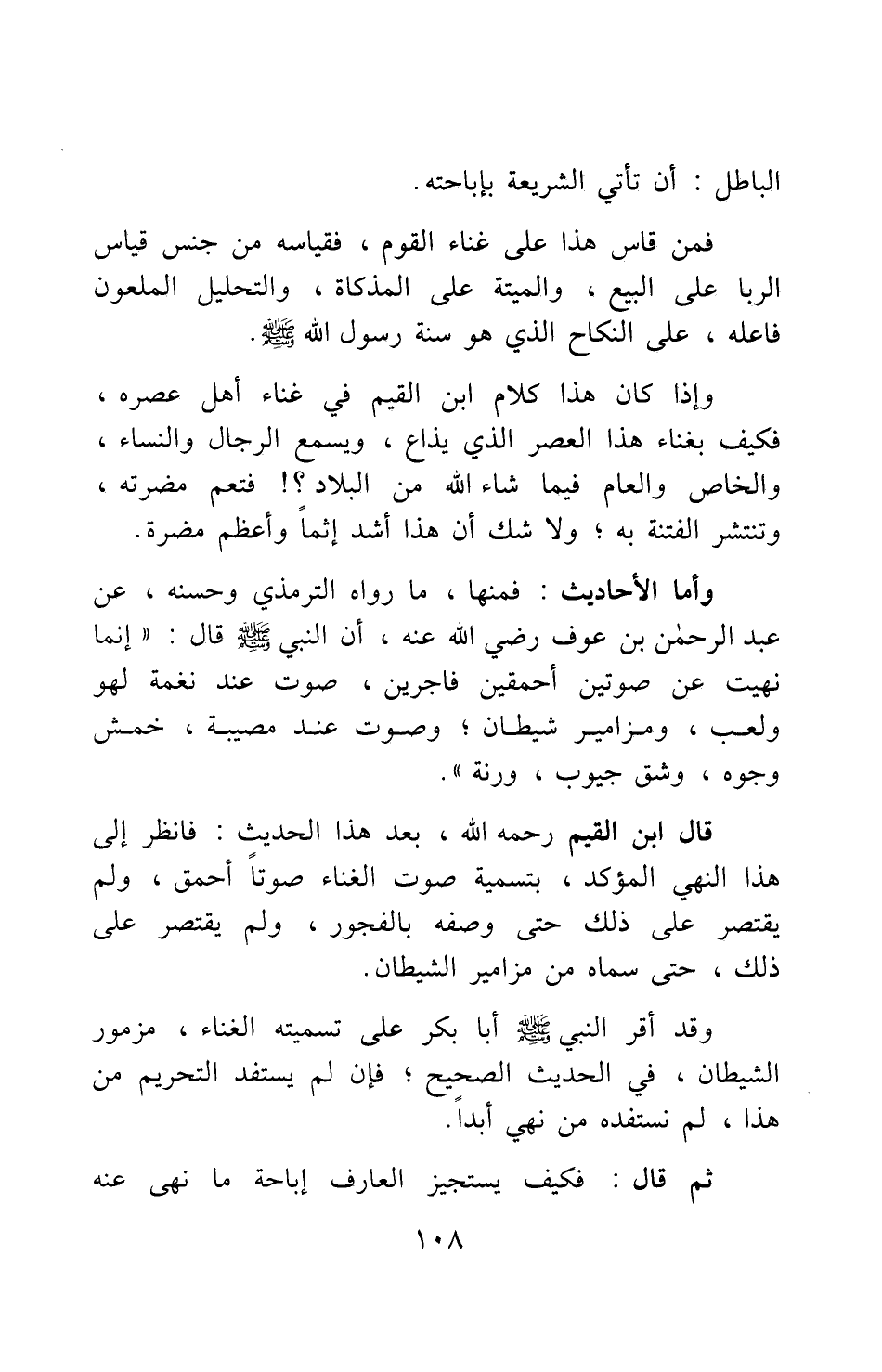 فمن قاس هذا على غناء القوم، فقياسه من جنس قياس الربا على البيع، والميتة على المذكاة، والتحليل الملعون فاعله، على النكاح الذي هو سنة رسول الله صلى الله عليه وسلم.