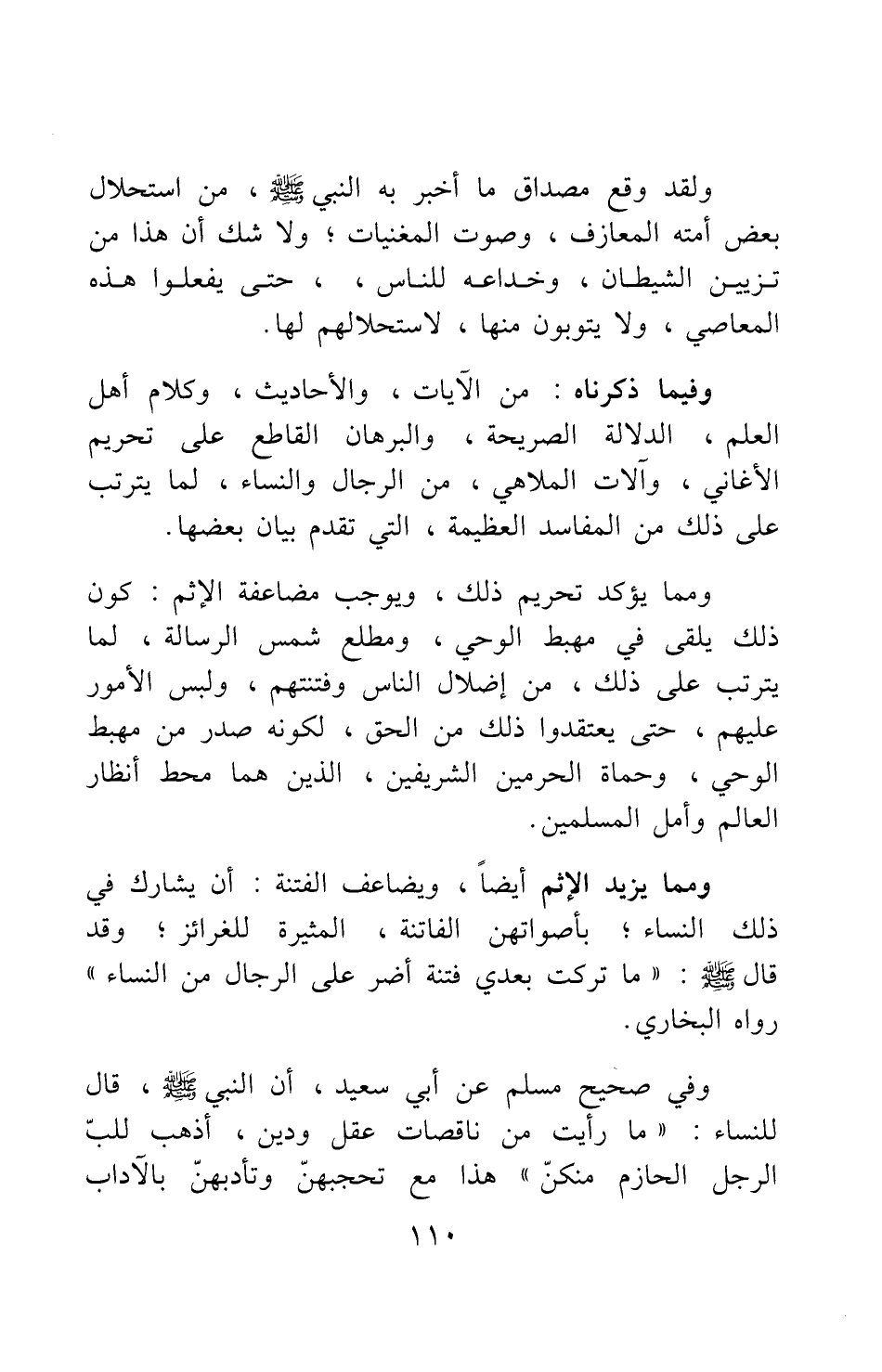 وفيما ذكرناه من الآيات، والأحاديث، وكلام أهل العلم، الدلالة الصريحة، والبرهان القاطع على تحريم الأغاني، وآلات الملاهي، من الرجال والنساء، لما يترتب على ذلك من المفاسد العظيمة التي تقدم بيان بعضها.