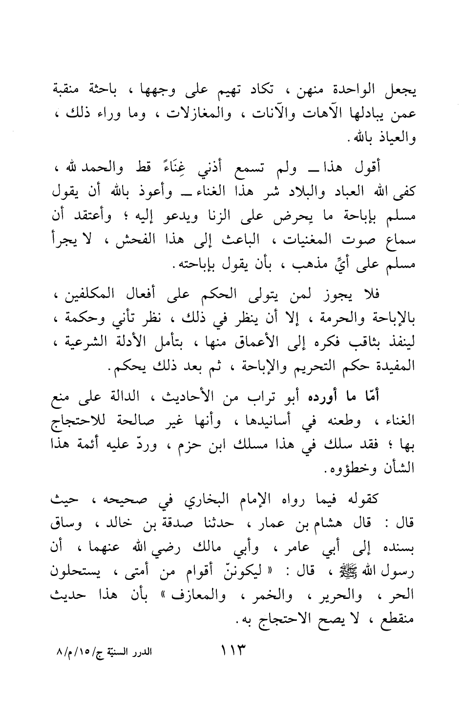 أقول هذا- ولم تسمع أذني غناء قط والحمد لله، كفى الله العباد والبلاد شر هذا الغناء- وأعوذ بالله أن يقول مسلم بإباحة ما يحرض على الزنى ويدعو إليه، وأعتقد أن سماع صوت المغنيات، الباعث إلى هذا الفحش، لا يجرُؤ مسلم على أي مذهب، بأن يقول بإباحته.