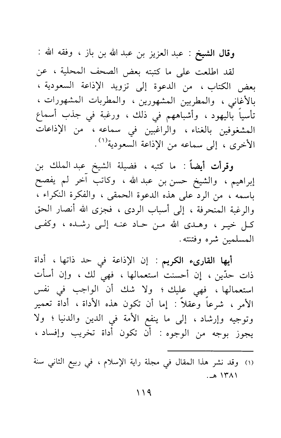 وقال الشيخ: عبد العزيز بن عبد الله بن باز، وفقه الله: لقد اطلعت على ما كتبته بعض الصحف المحلية عن بعض الكتاب، من الدعوة إلى تزويد الإذاعة السعودية بالأغاني، والمطربين المشهورين، والمطربات المشهورات، تأسيا باليهود وأشباههم في ذلك، ورغبة في جذب أسماع المشغوفين بالغناء، والراغبين في سماعه من الإذاعات الأخرى، إلى سماعه من الإذاعة السعودية 1.