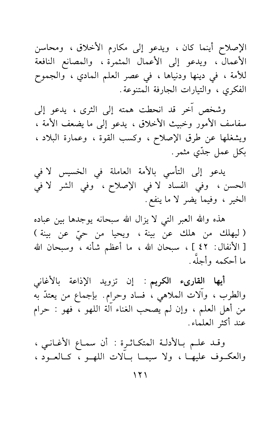 الإصلاح أينما كان، ويدعو إلى مكارم الأخلاق، ومحاسن الأعمال، ويدعو إلى الأعمال المثمرة، والمصانع النافعة للأمة، في دينها ودنياها، في عصر العلم المادي، والجموح الفكري، والتيارات الجارفة المتنوعة.