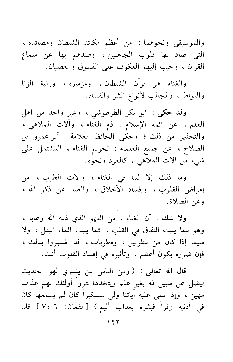 وقد حكى أبو بكر الطرطوشي، وغير واحد من أهل العلم، عن أئمة الإسلام: ذم الغناء، وآلات الملاهي، والتحذير من ذلك. وحكى الحافظ العلامة: أبو عمرو بن الصلاح، عن جميع العلماء: تحريم الغناء، المشتمل على شيء من آلات الملاهي، كالعود ونحوه. وما ذلك إلا لما في الغناء وآلات الطرب، من إمراض القلوب، وإفساد الأخلاق، والصد عن ذكر الله، وعن الصلاة.