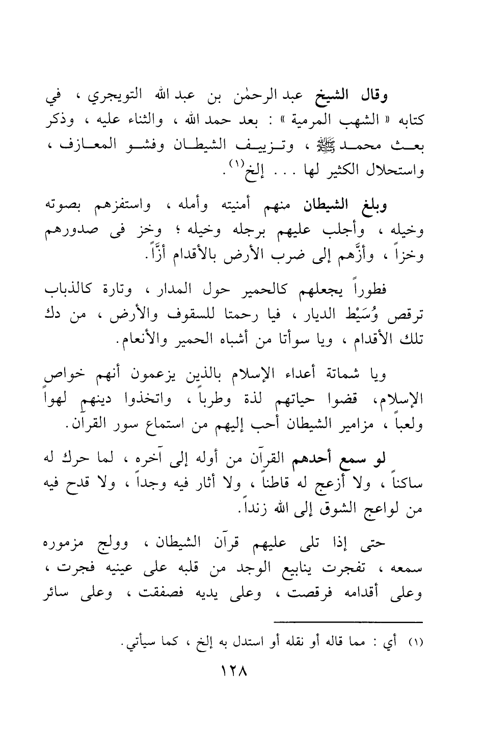 وقال الشيخ عبد الرحمن بن عبد الله التويجري، في كتابه "الشهب المرمية": بعد حمد الله، والثناء عليه، وذكر بعث محمد صلى الله عليه وسلم، وتزييف الشيطان وفشو المعازف، واستحلال الكثير لها.....إلخ 1.
