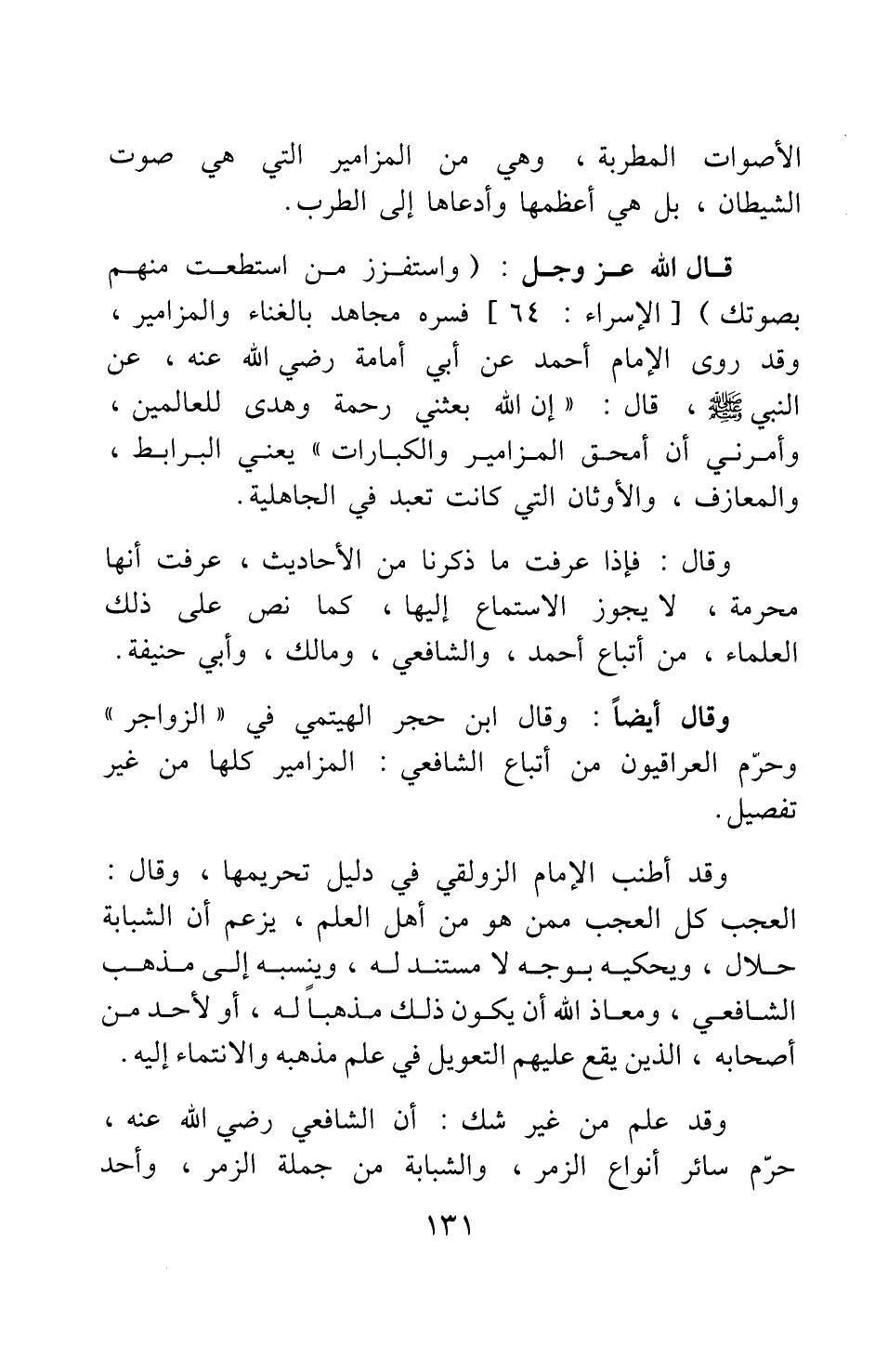 وقال أيضا: وقال ابن حجر الهيتمي في "الزواجر": وحرم العراقيون من أتباع الشافعي المزامير كلها من غير تفصيل.