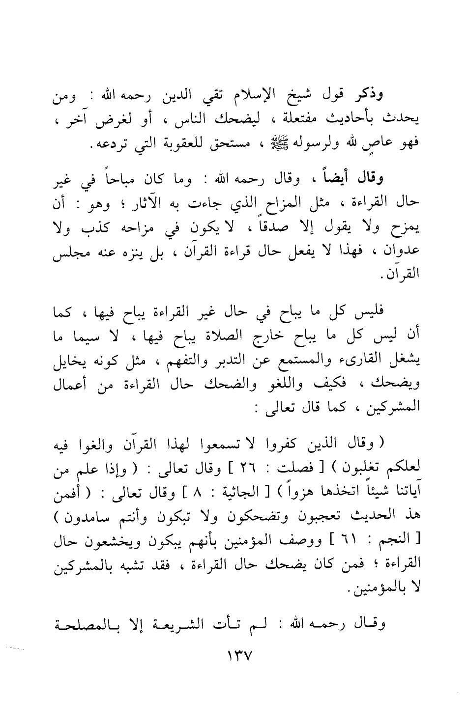 وقال أيضا، وقال رحمه الله: وما كان مباحا في غير حال القراءة، مثل المزاح الذي جاءت به الآثار، وهو أن يمزح ولا يقول إلا صدقا، لا يكون في مزاحه كذب ولا عدوان، فهذا لا يفعل حال قراءة القرآن، بل ينزه عنه مجلس القرآن.
