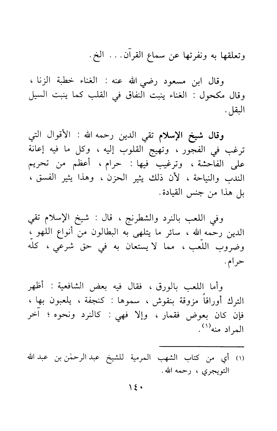 وفي اللعب بالنرد والشطرنج، قال شيخ الإسلام تقي الدين رحمه الله: سائر ما يتلهى به البطالون من أنواع اللهو، وضروب اللعب، مما لا يستعان به في حق شرعي، كله حرام. وأما اللعب بالورق، فقال فيه بعض الشافعية: أظهر الترك أوراقا مزوقة بنقوش، سموها كنجفة، يلعبون بها؛ فإن كان بعوض فقمار، وإلا فهي كالنرد ونحوه، آخر المراد منه 1.