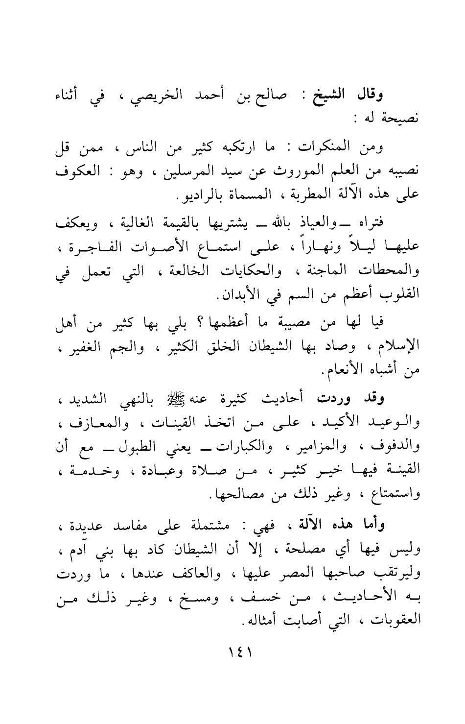 ومن المنكرات: ما ارتكبه كثير من الناس، ممن قل نصيبه من العلم الموروث عن سيد المرسلين، وهو: العكوف على هده الآلة المطربة، المسماة بالراديو.
