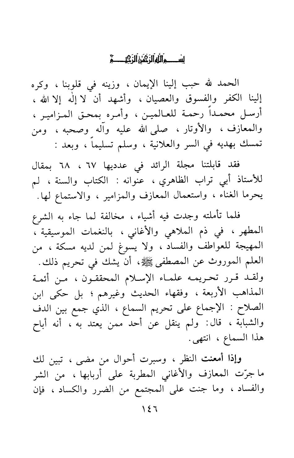 الحمد لله حبب إلينا الإيمان، وزينه في قلوبنا، وكره إلينا الكفر والفسوق والعصيان، وأشهد أن لا إله إلا الله، أرسل محمدا رحمة للعالمين، وأمره بمحق المزامير، والمعازف، والأوتار، صلى الله عليه وآله وصحبة، ومن تمسك بهديه في السر والعلانية، وسلم تسليما، وبعد: